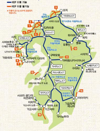 Kyushu Expressway Pass(KEP)소개 정액으로 규슈 고속도로를 마음껏 이용 가능한 Kyushu Expressway Pass를 판매하고 있습니다. ※단, 일부 구간은 제외됩니다. 지정 렌터카 회사에서 제공한 ETC 카드를 이용하면 요금소에서 정지하지 않고 고속도로를 이용할 수 있습니다! 외국인 대상의 렌터카 한정 패스입니다. 요금제는 2일 3,500엔부터이며 이용 기간이 길어질수록 저렴하게 이용하실 수 있습니다. 2일 요금제~최대 10일 요